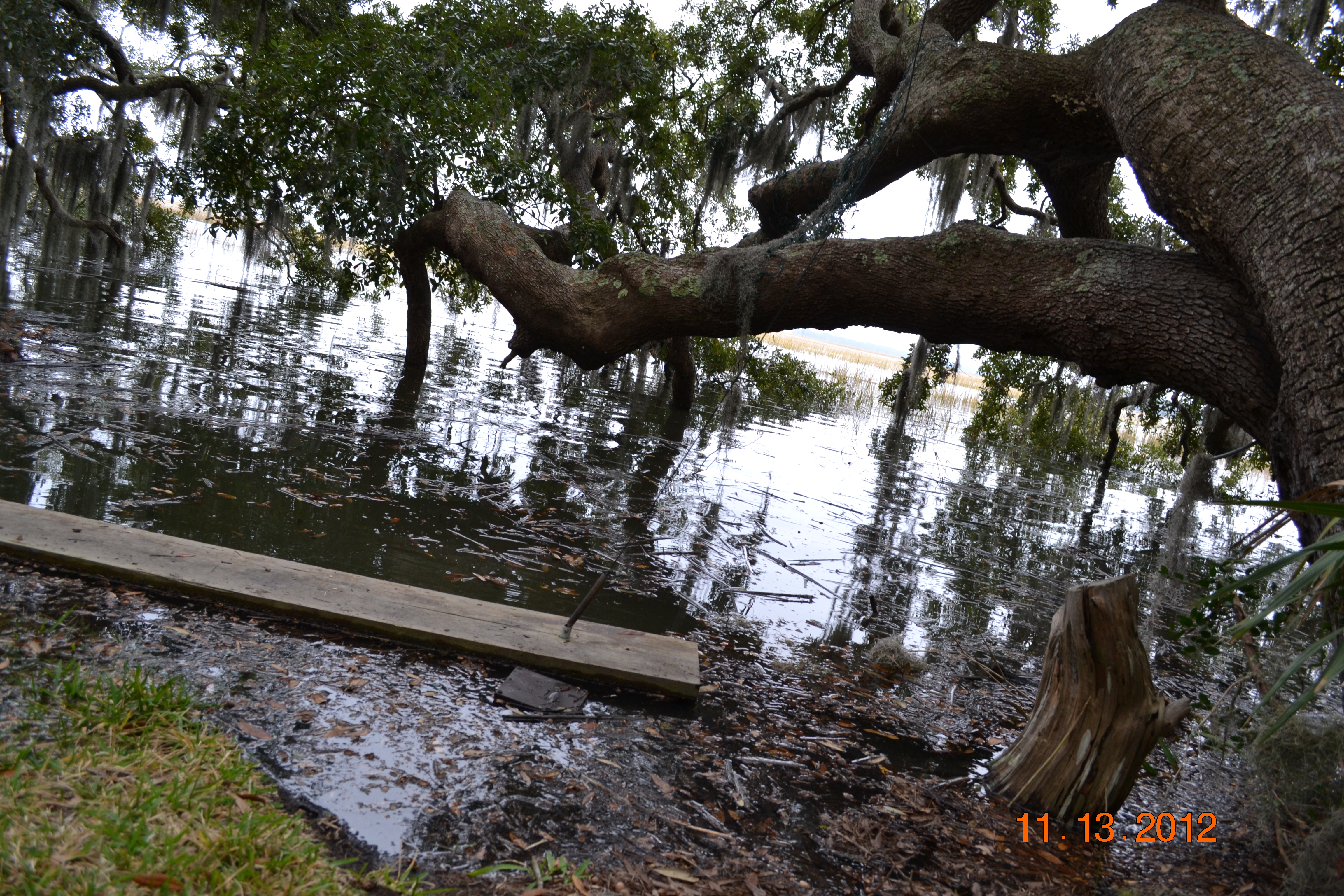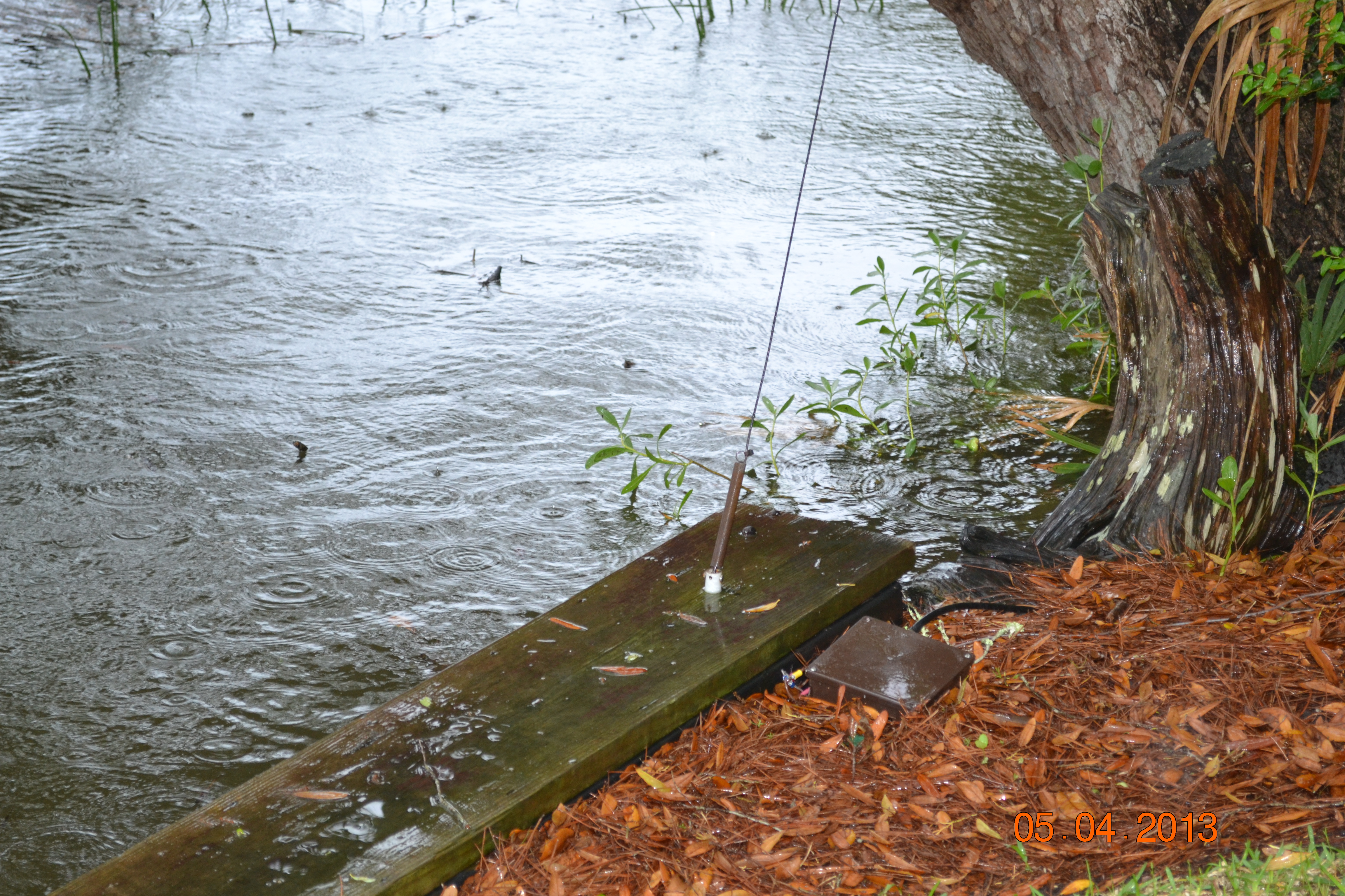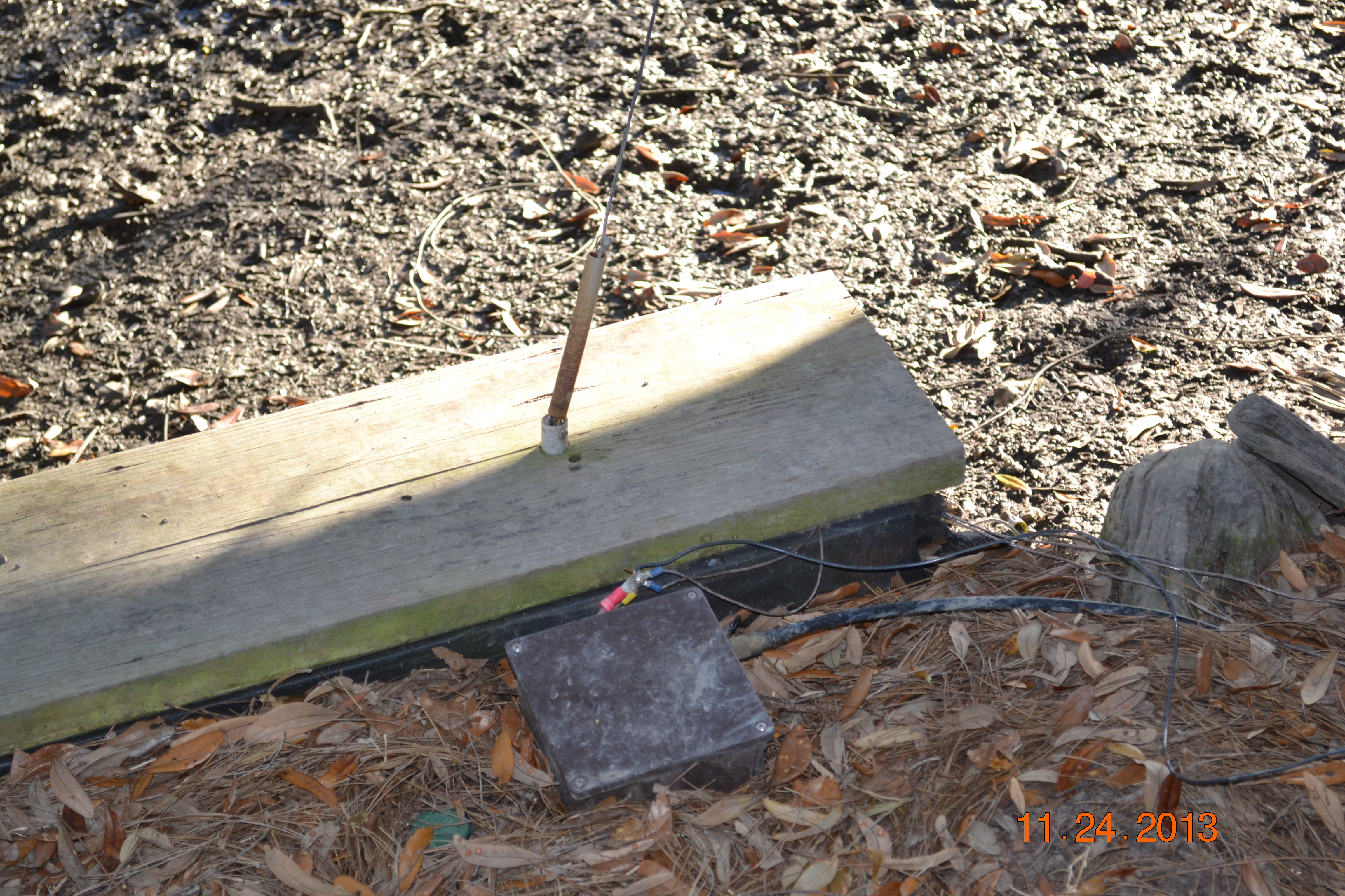 The coax goes from shack 80' away. The box is over (hole inside) a ground rod 8' into the Marsh Bed. A radial bus goes through the bulkhead 2' to another 8' ground rod, and the #6 copper bus connecting them has about 16 radials into the marsh and on my back yard, also connected to a sprinkler system control wire which is laid over about 1 Ac of Sod ±. (Not sure if adds anythng as the X, R, and SWR did not change when I hooked it up). An insulator tube penetrates the top of the bulkhead and contains a slacking spring. The antenna wire runs up through the "Bird Feeder". The lower 10' is 15KV insulated wire. After the Feeder, the wire continues up for a total of 30' vertical. Then continues West horizontally for another 95' and is about 25' above the ground.
