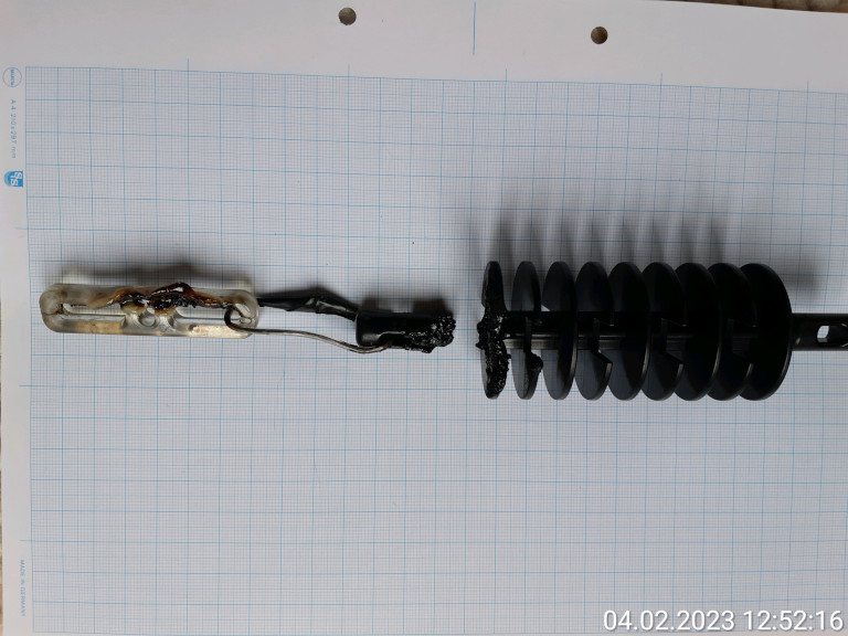 "Pic.1: Molten insulator during rainy weather. My T-Antenna had such an insulator-