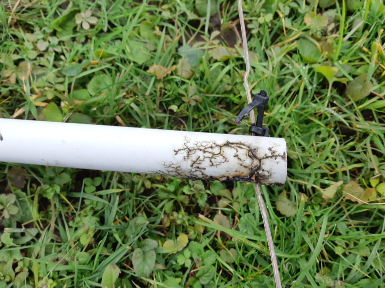 "Pic.2: Lichtenberg figures have eaten inside lossy PVC tube of my 3-wire flat top capacitance.