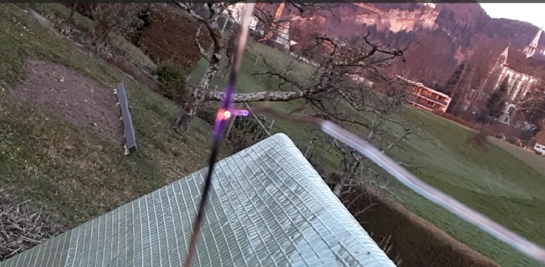 "Last night the weather was cold and dry, so I turned on the transmitter and sent out a single FW-15 sequence on 137.51 kHz. Antenna current was a little above average at 4.3 A rms, or 19 kV rms on the antenna. Looking out of the window where the coil is placed, I noticed two little violet flames, dancing on the wire! Over the years, the polyethylene insulation has become very brittle, exposing the metal to the air. Looking more closely, I saw that the wire near the coil happened to have two kinks with sharp turns, producing those sizzling corona discharges. A short video is