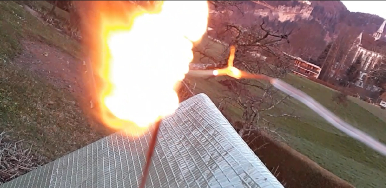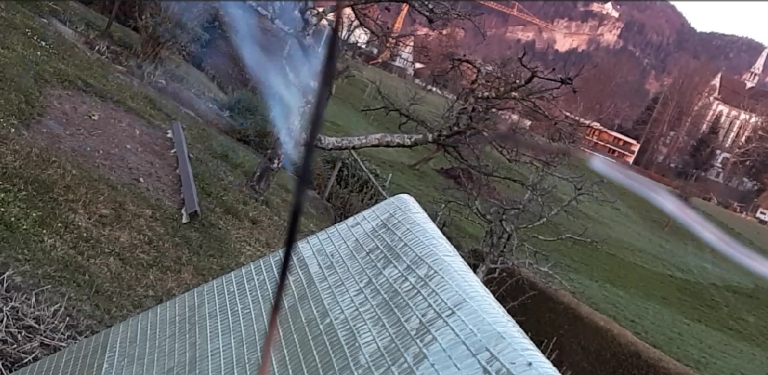 One can see that the PVC coating of the touched antenna wire immediately starts burning under