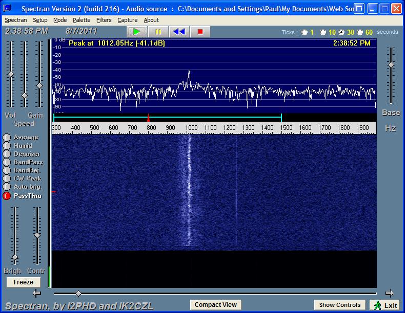 18 June 2011 - Video carrier from eastern Europe. In the sound clip you will hear the carrier at 430 Hz and in the spectrogram the carrier is clearly visible. My receiver was tuned to 49.760.00 USB mode.