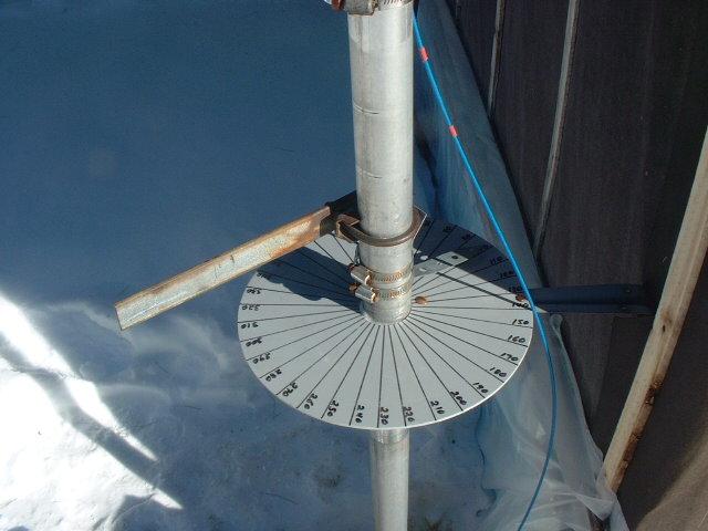 Here you can see the scale and pointer used to read the azimuth at the bottom of the mast, and the handle used to rotate the mast. At the top of the picture you can also see part of a clamp that holds the elevation cable at the proper point. The red spots on the elevation cable are pieces of heat shrinkable tubing. There is one mark for every 10 degrees of elevation. The azimuth scale is a piece of plastic that has radial lines drawn every 10 degrees. It is attached to the side of the house with an "L" shaped bracket. The azimuth pointer (which can be partly seen on the right in this photo -- some of the pointer is in the shadow) is just a thin piece of metal clamped to the mast. It points in the same direction as the front of the yagi. |
