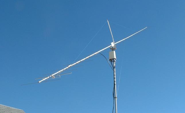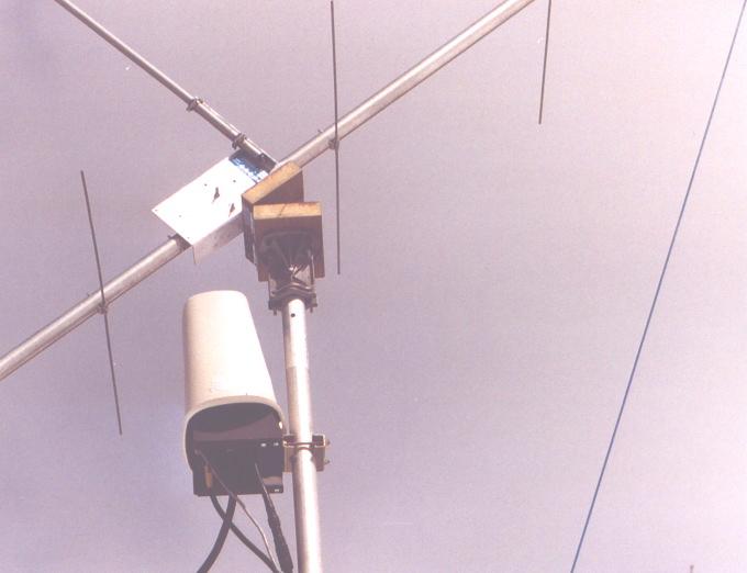 The antenna. Preamp and relays are mounted under the small trash bin at the top of the mast. The simple home made hinge mechanism can be seen. You can also see a thin steel cable attached to the front part of the yagi and running down to the mast. By releasing the tension on this wire, the yagi can be elevated (the back of the yagi is more heavy than the front, so the front goes up unless it is held down to some point by the steel cable). |